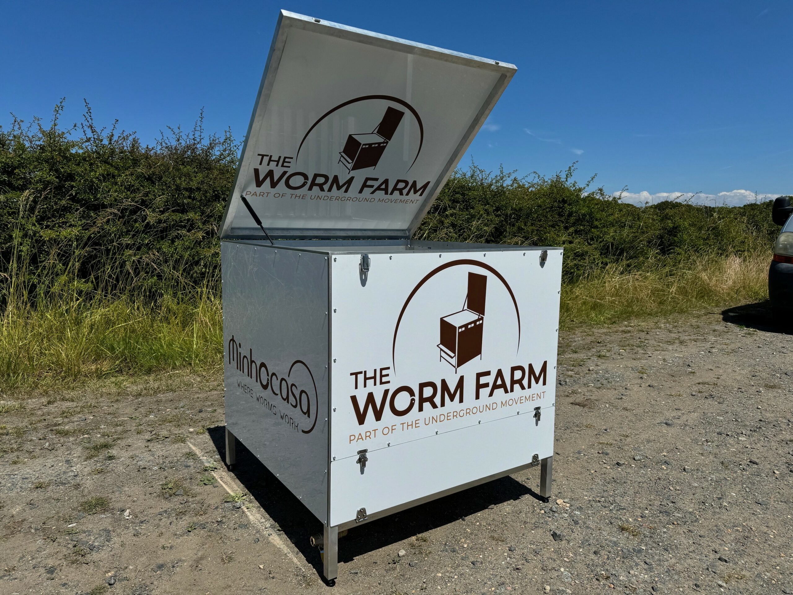 During lockdown, Simon began designing what would become the Minhocasa, a hand-built aluminium wormery manufactured on the Island. The system uses a unique flow-through design: worms live within the central bedding area, move upward to feed and downward to deposit vermicast. This allows for continuous, straightforward harvesting. Unlike many plastic systems, the Minhocasa is: